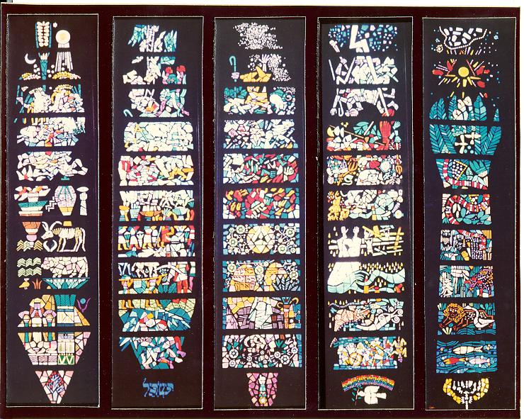 In addition to the Gropper Windows, West Suburban Temple Har Zion is the home of the massive Milton Horn Sculpture, "Not by Might . . .," At the time of it's completion (between 1950 and 1952) the use of such representational imagry on a Conservative Syanagogue was quite controversial. Since that time historians have placed the use of images in Jewish art in greater perspective (but the older attitude also explains why there are no details in the face of Noah in the Gropper Windows).